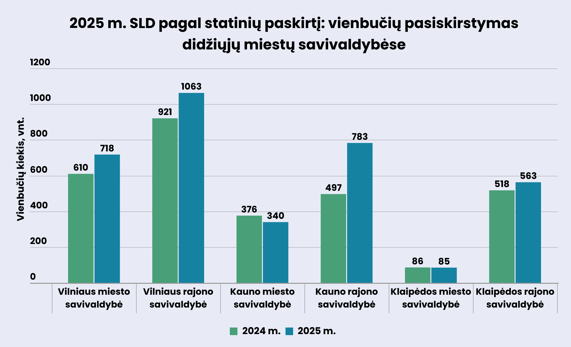 Išanalizavus visuomenei atvertus statybos leidimų duomenis, viešinamus įstaigos tinklapyje, matyti, kad praėjusiais metais patvirtintuose SLD dažniausiai minėti vienbučiai namai – jų statybos leidimuose fiksuota beveik 6,5 tūkst. (6 414 vnt.). Vienbučių kiekis, lyginant su 2024 metais, pernai augo 8,39 proc. ir paskirčių TOP10-uke iš antrosios vietos pakilo į pirmąją.