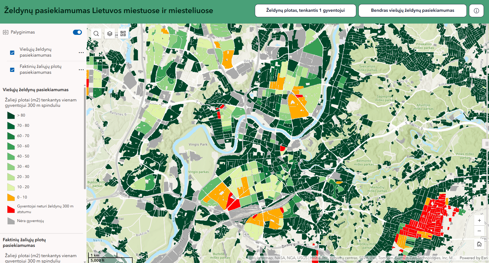 Kad švieslente naudotis būtų paprasčiau, joje pateikiami du skirtingo detalumo žemėlapiai. Skiltyje „Bendras viešųjų želdynų pasiekiamumas“ pateikiamas šalies žemėlapis, kuriame atvaizduojama, kiek procentų miesto ar miestelio gyventojų viešuosius želdynus pasiekia 300 metrų atstumu. O antrame duomenų sluoksnyje „Želdynų plotas, tenkantis 1 gyventojui“ galima detaliai analizuoti konkrečių mikrorajonų ir net sklypų situaciją, juos lyginti tarpusavyje.